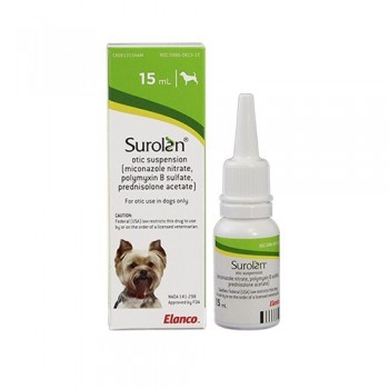 15ml Surolan is a prescription topical antibiotic for cats and dogs that is used to treat otitis externa (ear inflammation) and skin infections caused by bacteria.